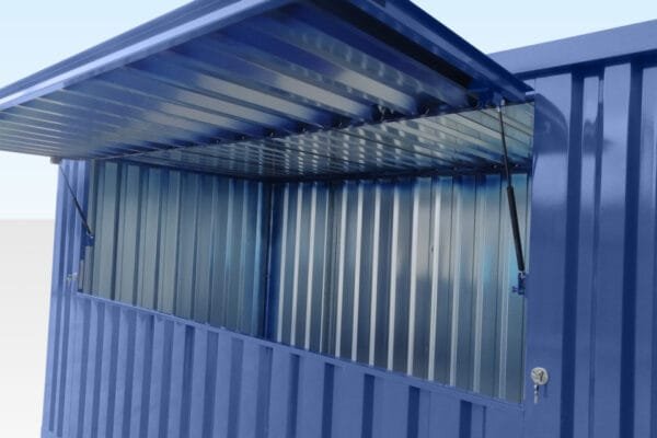 Double door flat pack container with side opening hatch (hinged from the top) fitted to the 4m side. This hatch can be positioned on either of the long sides to meet your requirements.